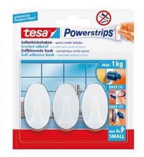 TESA Klebehaken Powerstrips® small 3 Stück weißKlebehaken 3 Stück für fast alle Oberflächen geeignet (Fliesen, Glas, Holz, Kunststoff) nicht geeignet für Vinyltapeten, antihaftbeschichtete Oberflächen, Styropor, Schaumstoff, poröse Materialien) selbstkleben, rückstandslos von glatten Oberflächen ablösbar für Gegenstände bis 1 kg Gewicht weiß Die TESA Klebehaken lassen sich einfach und ohne Bohren auf fast allen Oberflächen anbringen. Die Haken sind aus hochwertigem Kunststoff gefertigt und lassen sich rückstandslos wieder entfernen. Die Klebehaken bieten einen sicheren Halt für Gegenstände bis zu 1 kg Gewicht. Der Klebestreifen wird vom Wandhaken komplett verdeckt.