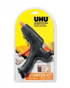 UHU Heißklebepistole inkl. 6 HeißklebepatronenHeißklebepistole inkl. 6 Heißklebepatronen Schmelztemperatur: 170°C Klebefluss: 16g/Minute Leistung: 55 W einfach zu bedienen und zu dosieren mechanischer Patronenvorschub hitzeisolierte Düse elektronische Temperatursteuerung klebt schnell und dauerhaft viele verschiedene poröse und glatte Materialien zum Basteln, Befestigen, Reparieren, Isolieren und Abdichten geeignet schwarz Die UHU Heißklebepistole ist für Klebepatronen mit einem Durchmesser von 11 mm geeignet und erreicht eine Schmelztemperatur von 170°C sowie einen Klebefluss von 16 Gramm pro Minute. Die Heißklebepatronen kleben in Sekunden viele verschiedene poröse und glatte Materialien. Die Klebepatronen sind lösungsmittelfrei, beständig gegen UV-Licht, Waschpulver und -mittel, wetter- und temperaturbeständig. Die Heißklebepistole wird inklusive 6 Klebepatronen im Blister geliefert.